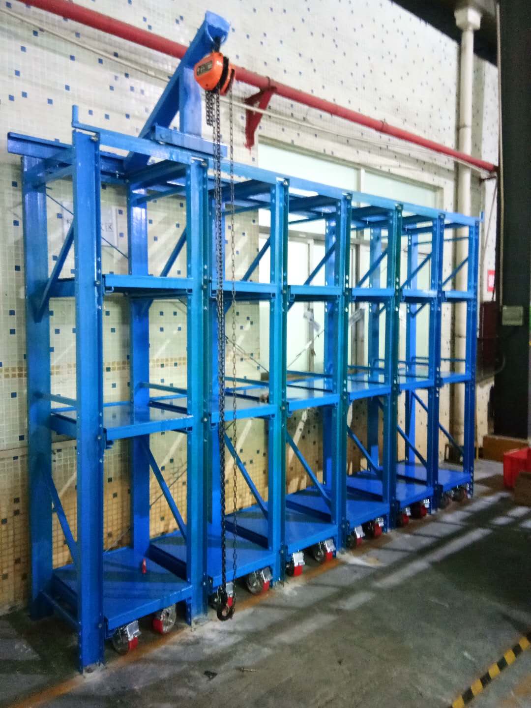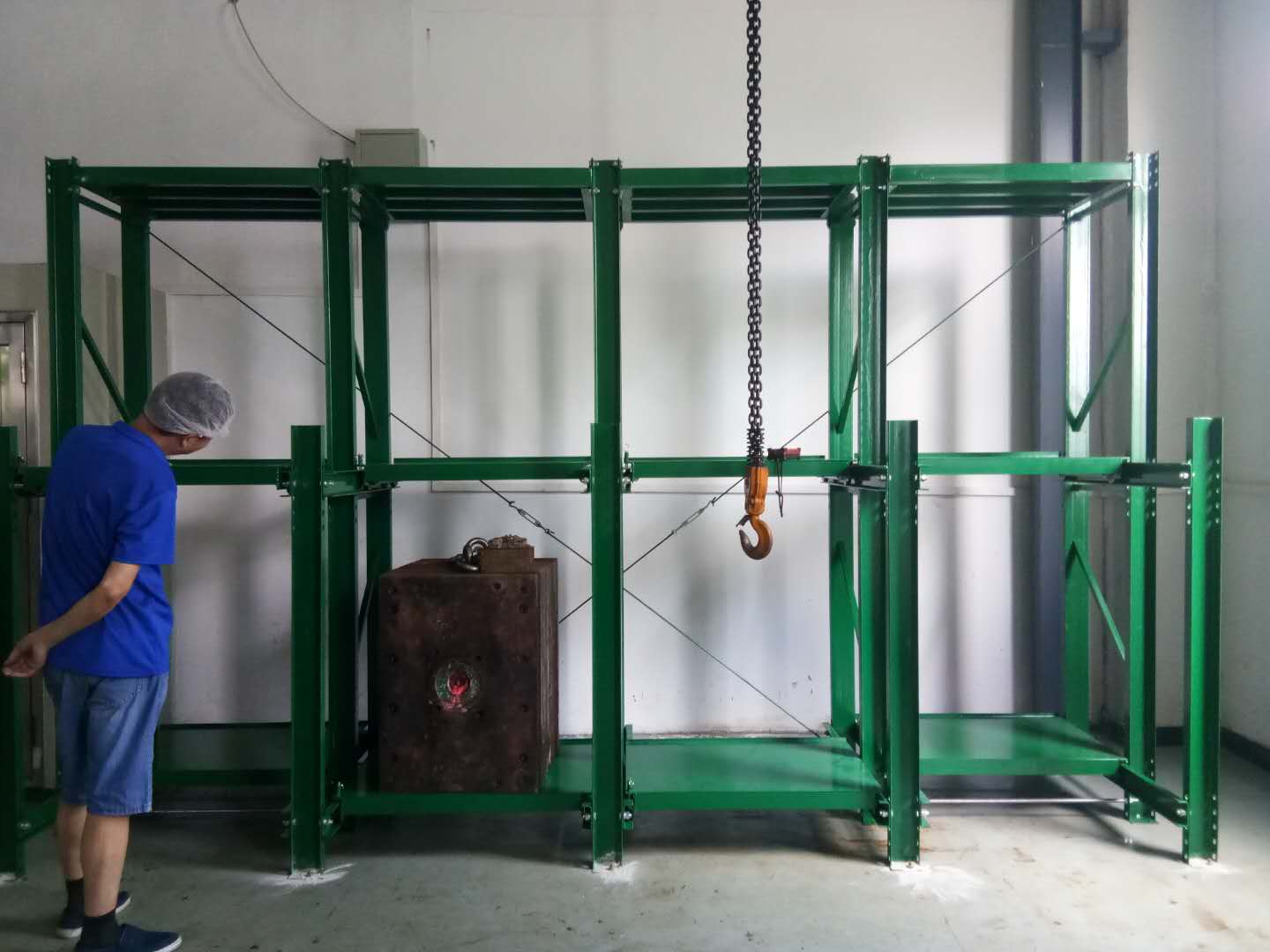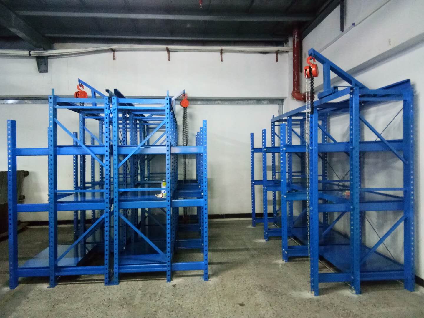 ● 模具架抽板承載模具后輕松抽拉,上下間隔隨意調整,協同備有的天車和手動葫蘆可輕松、快捷的完成模具存取工作;